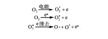 上述反應式表示氧氣在微波高能電場作用下,初步生成O2陽離子和高速運動的自由電子;氧氣在激發態的自由電子的轟擊作用下變為激發態,生成了自由電子的過程;激發態的氧氣分子在高速運動的自由電子作用下生成大量的氧自由基、氧正離子和激發態的自由電子。